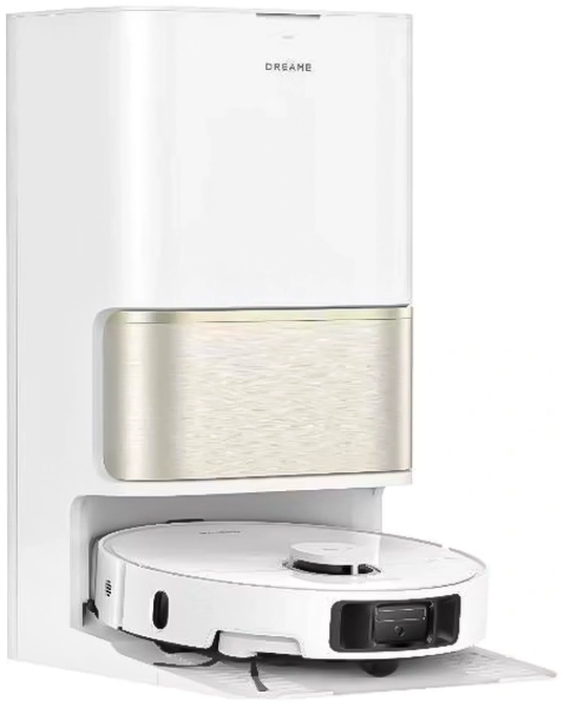 Dreame L50 Ultra CE сочетает мощную сухую и влажную уборку с интеллектуальной навигацией. Белый корпус с золотистыми акцентами подчеркивает премиальный стиль устройства.