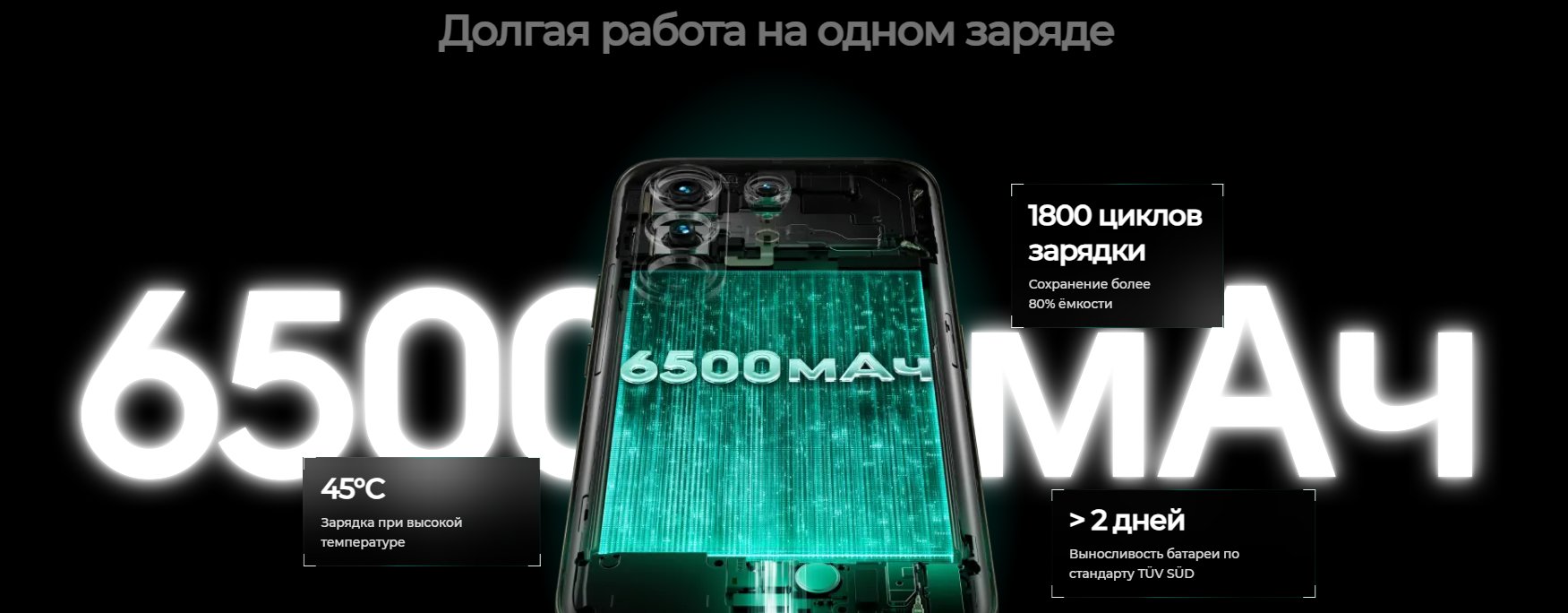 Аккумулятор емкостью 6500 мАч обеспечивает длительное время работы без подзарядки. Поддержка быстрой зарядки позволяет быстро восполнить заряд и продолжить использование устройства.